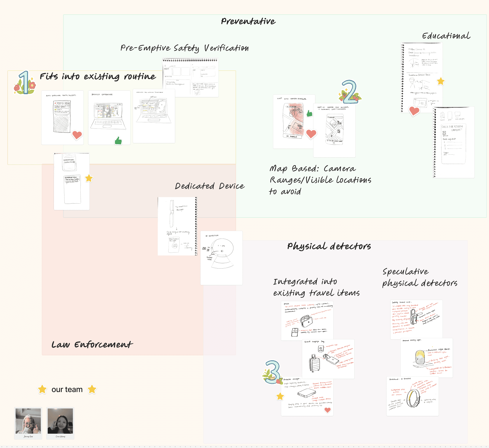I created quick exploratory sketches for the most feasible ideas from the previous steps. The sketches were then sorted by strength, weaknesses, and feasibility.